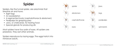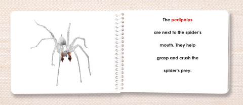Look at the pedipalps on this spider! He is definitely looking for love; that's what swollen pedipalps mean. Look through these cards and discover each of the key parts of its external anatomy. The photos include the featured part in full-color while the rest of the image fades into muted shades of gray. For the first time, it is really clear what we want them to focus on!
